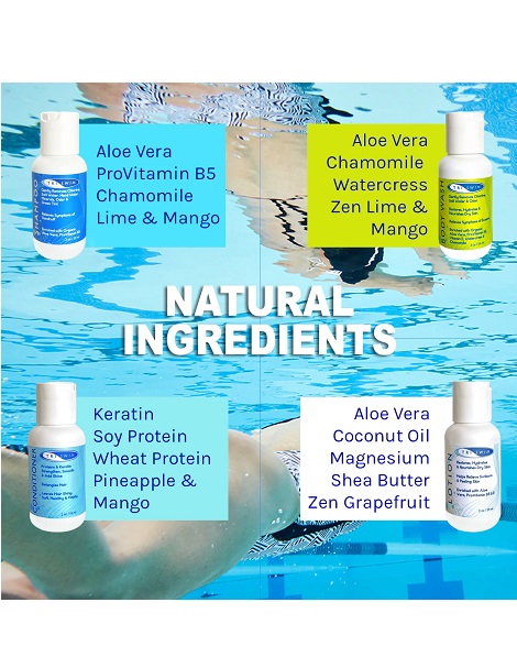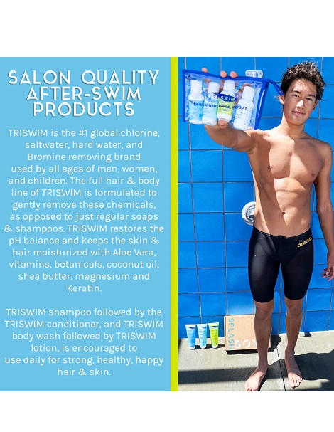 普通的洗護用品是不能夠清除掉泳後頭髮和身體上附著的氯元素和銅離子;只有經過特殊的過程"抓取,隔離和去除"附著在身體上的氯和銅.TRISWIM專有獨特配方,含5種"隔離介面(sequesting agents)",能有效去除氯,銅及絕大部分附著和沉積在身體上的有害物質.TRISWIM還含有比一般藥妝更大量的有機蘆薈活性物質,維生素A,E和原B5,能有效減輕夏季游泳時日曬對頭髮和身體的損傷(從對身體的損害角度來看,日光也是一種氧化劑).