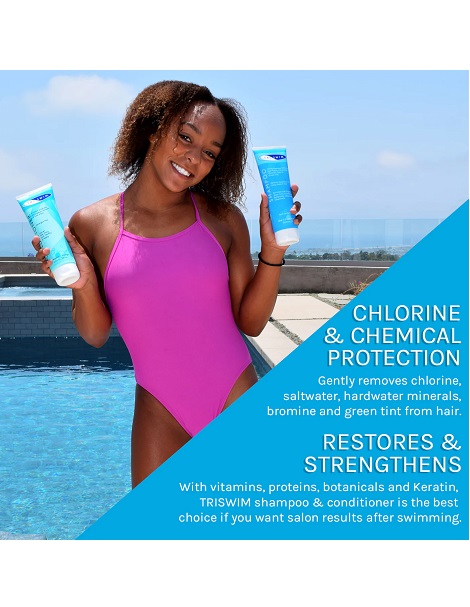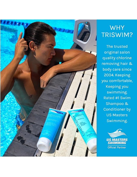 普通的洗護用品是不能夠清除掉泳後頭髮和身體上附著的氯元素和銅離子;只有經過特殊的過程 "抓取,隔離和去除" 附著在身體上的氯和銅。TRISWIM專有獨特配方,含5種 "隔離介面(Sequesting agents)",能有效去除氯,銅及絕大部分附著和沉積在身體上的有害物質。TRISWIM還含有比一般藥妝更大量的有機蘆薈活性物質,維生素A,E和原B5,能有效減輕夏季游泳時日曬對頭髮和身體的損傷 (從對身體的損害角度來看,日光也是一種氧化劑)。